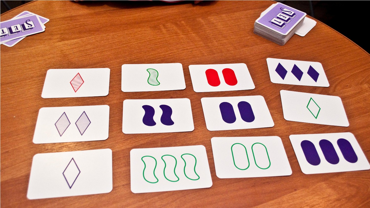 На картах нарисованы простые фигуры, обладающие четырьмя характеристиками. Игрокам нужно составить набор (по английски – «set») из трёх карт, в котором каждая из характеристик изображённых фигур будет либо одинаковая для всего набора, либо разная – то есть не повторяющаяся ни на одной карте.